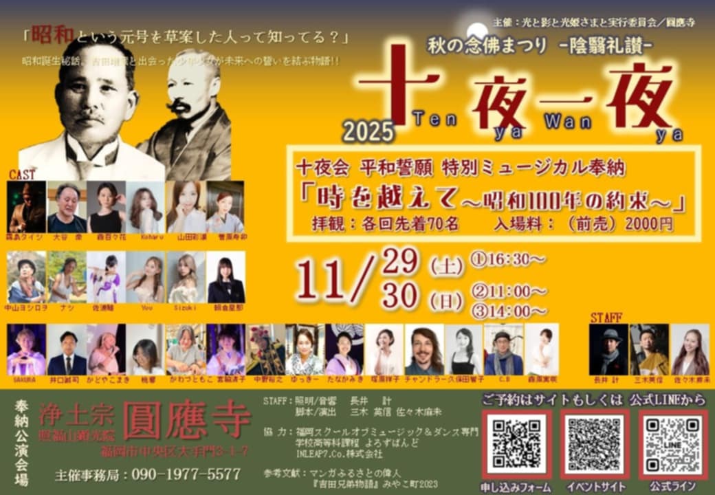 「時を越えて~昭和100年の約束~」 2025年も圓應寺の秋の念佛まつり「十夜一夜(てんやわんや)」が開催されます。 黒田官兵衛の正室・光姫様の菩提寺でもあるお寺「圓應寺」で、今年も秋の念佛まつり「十夜一夜(てんやわんや…