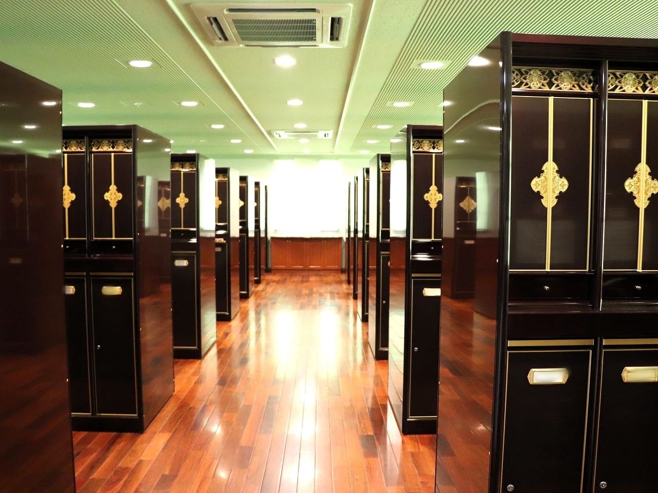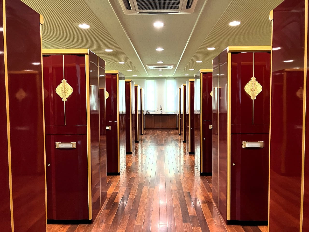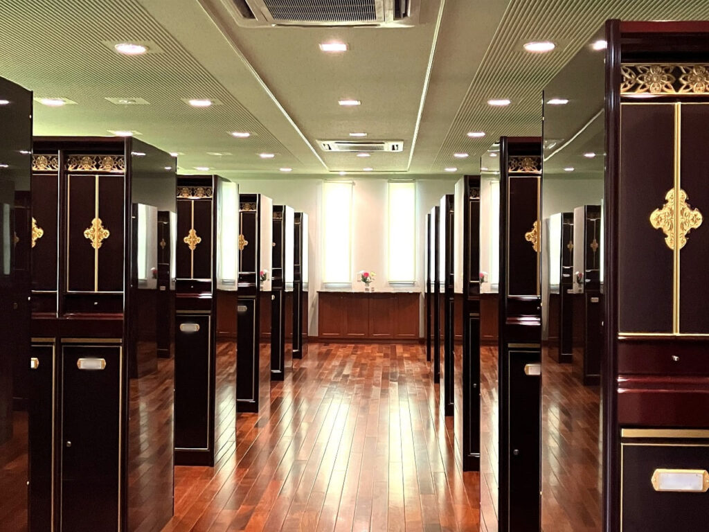 どの納骨室も静かな落ち着いた雰囲気で、えんじ色や黒色の和モダンの納骨壇が整然と並んでいます。