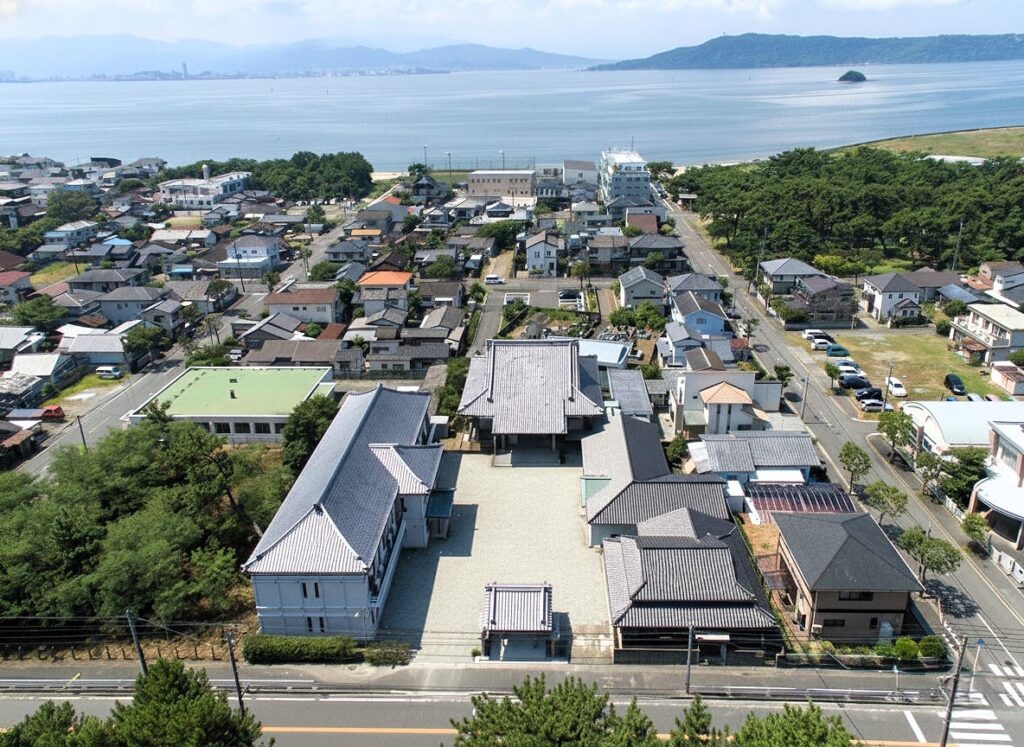 境内は海の中道海浜公園の目の前にあり、潮風を含んだ爽やかな環境の中で、荘厳なたたずまいの伽藍を構えています。