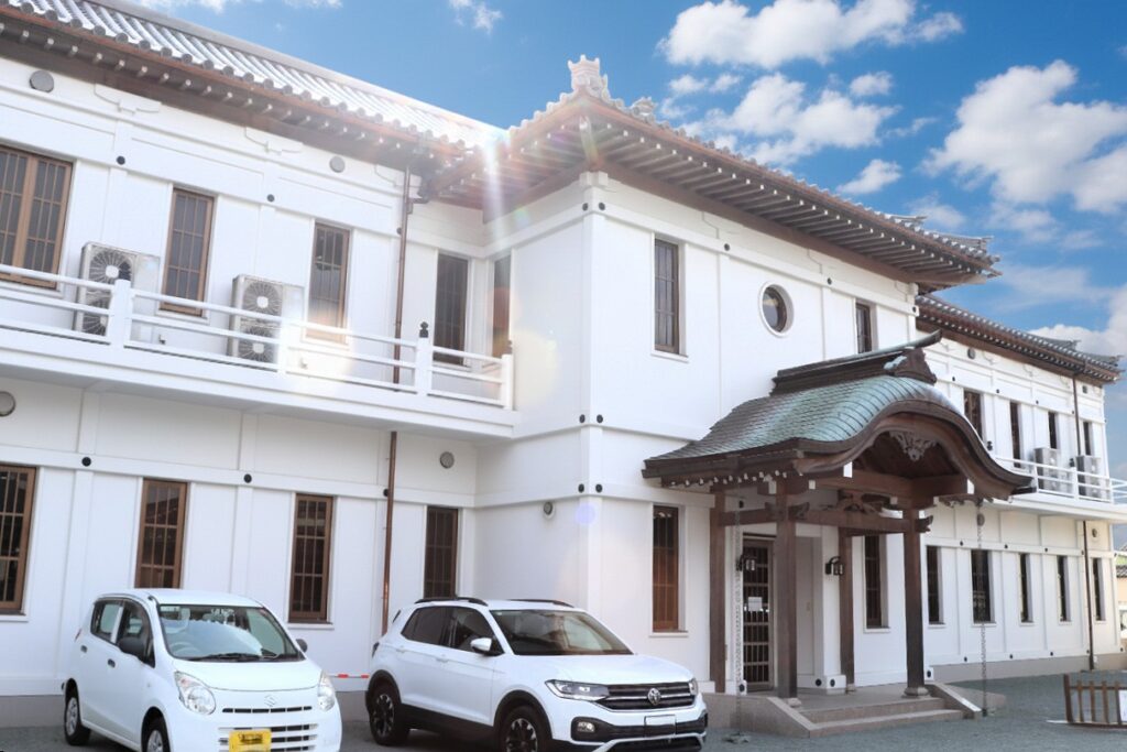 平成7年には本堂、門徒会館、庫裏を、さらに平成17年にはレトロな洋館の趣きが漂う白亜の納骨堂、そして平成27年には総檜作りの山門を新設。