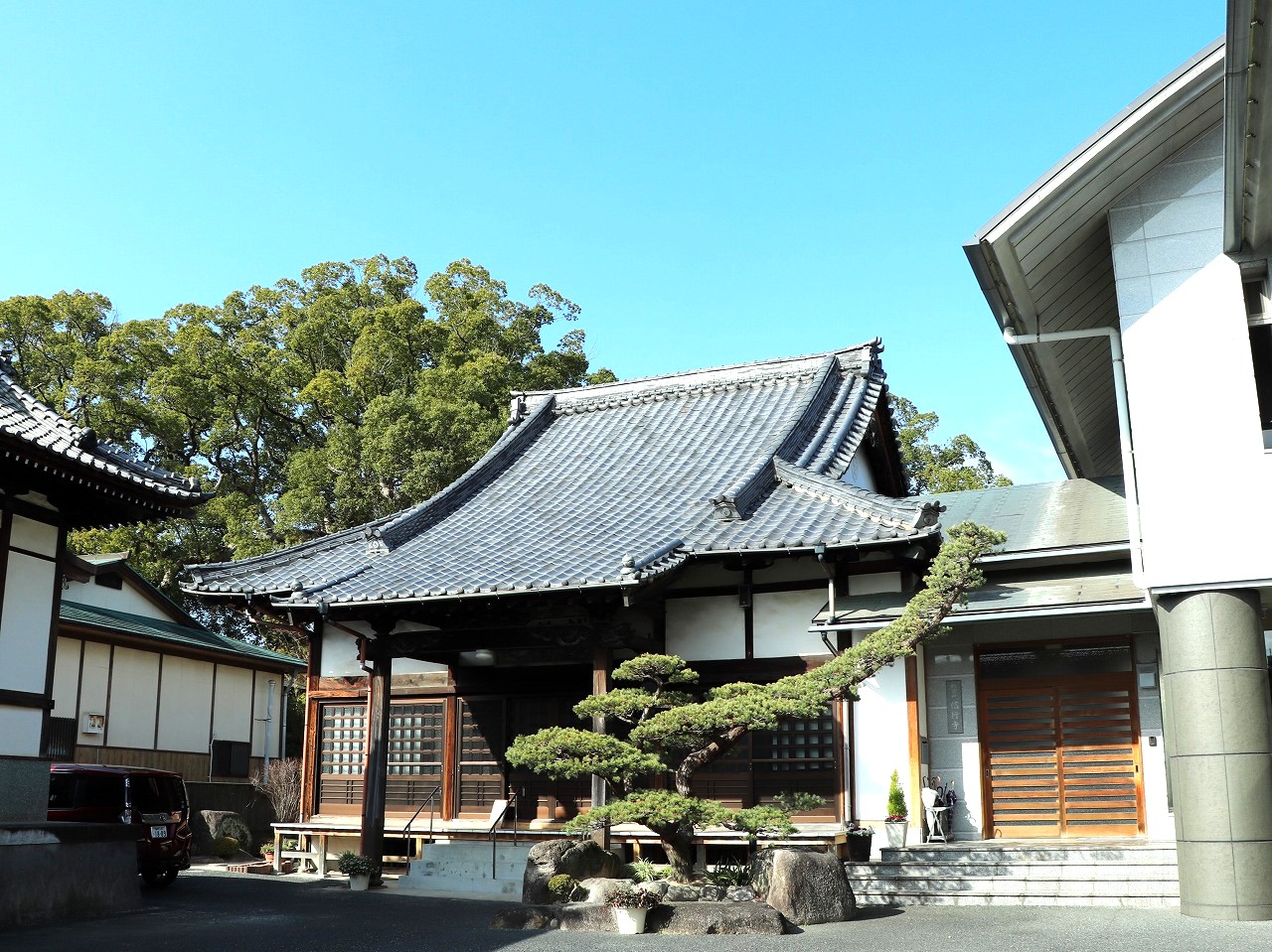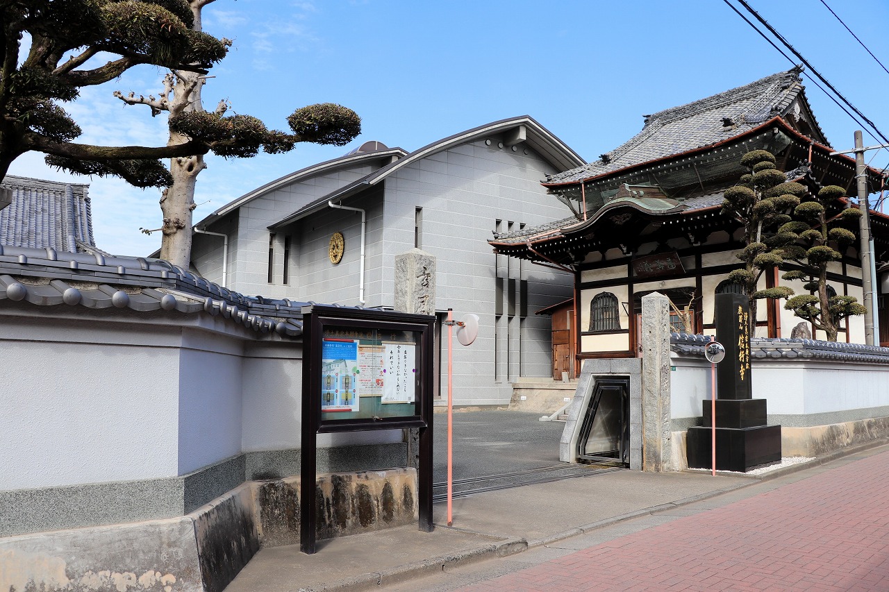 JR宇美駅より徒歩わずか5分、県道68号線から宮前通りに入り少し進むと、左手に信行寺の伽藍が広がっています。