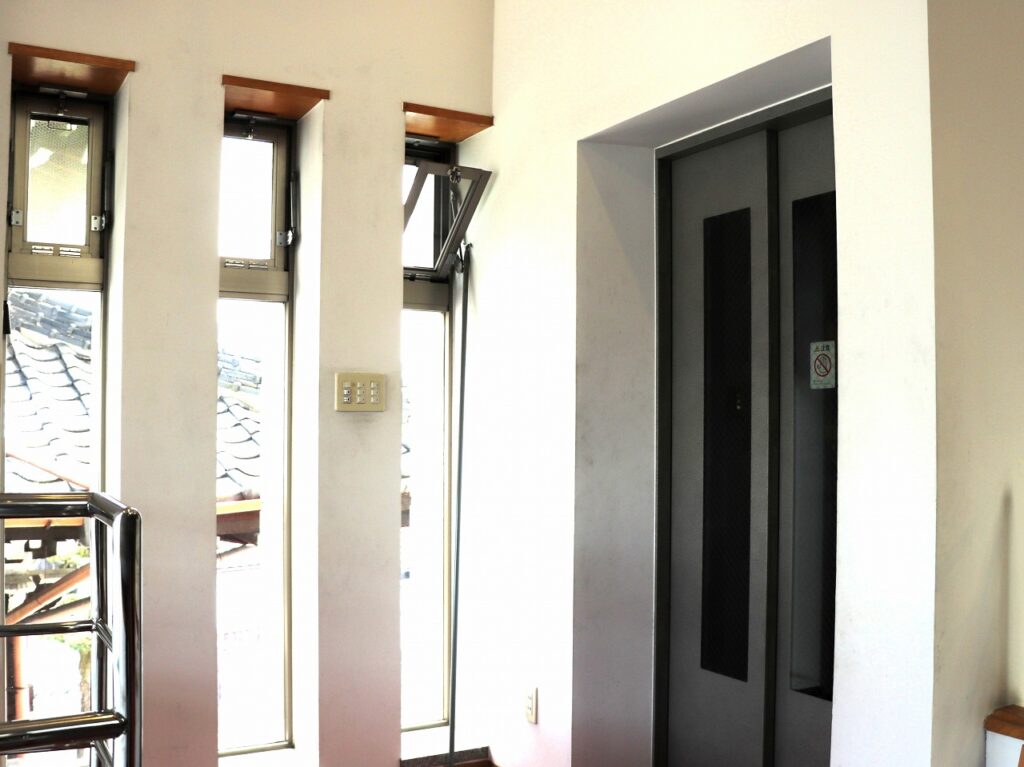 堂内に入ると天井から明るい光が注ぎ込みます。バリアフリー仕様で2階の納骨室にもエレベータで移動できます。