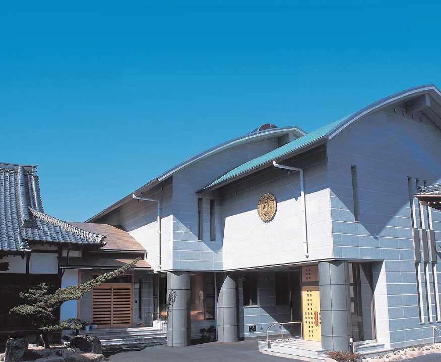 掲示板に掲げられた標語にうなづきながら境内に入ると、右側に和モダンのおしゃれな納骨堂「無量寿堂」、そして正面に歴史を感じる本堂が迎え入れてくれました。